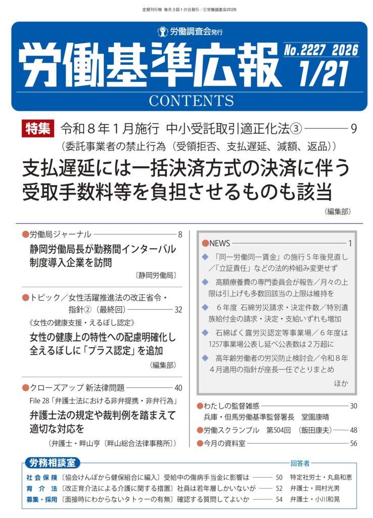 畔山亨弁護士が「弁護士法における非弁提携・非弁行為」を執筆しました。 公開日:2026年1月16日 お知らせ 畔山亨弁護士が労働基準広報2026年1月21日号(No.2227)掲載の「弁護士法における非弁提携・非弁行為」(クローズアップ新法律問題 File 28)を執筆しました。 投稿ナビゲーション 畔山亨弁護士が「公務員に対する懲戒処分と裁量権の範囲」を執筆しました。