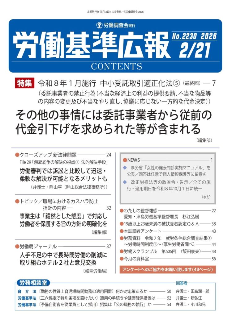 畔山亨弁護士が「解雇紛争の解決の視点① 法的解決手段」を執筆しました。 公開日:2026年2月12日 お知らせ 畔山亨弁護士が労働基準広報2026年2月21日号(No.2230)掲載の「解雇紛争の解決の視点① 法的解決手段」(クローズアップ新法律問題 File 29)を執筆しました。 投稿ナビゲーション 畔山亨弁護士が「弁護士法における非弁提携・非弁行為」を執筆しました。